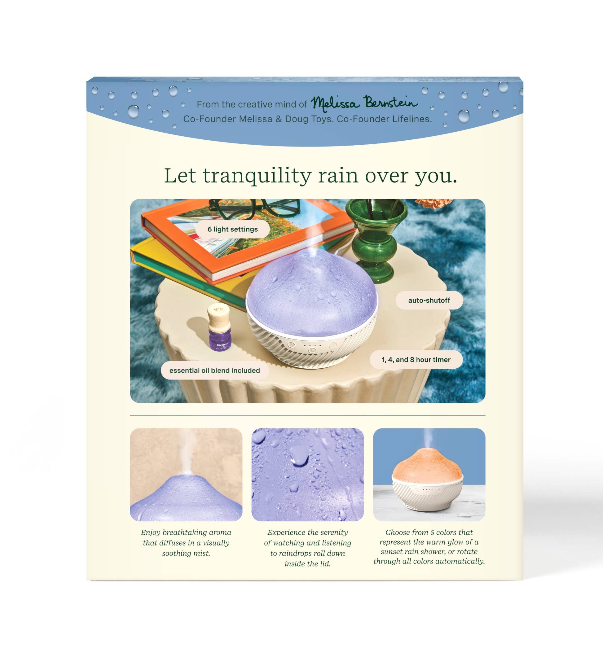 Let tranquility rain over you with the Lifelines Cloud Ultrasonic Diffuser, a multi-sensory experience that transforms your space into a serene oasis. This innovative diffuser generates a cloud-like mist that condenses into droplets, gently rolling down the lid like rain, while diffusing a soothing aroma—Essential Oil Blend included!—for a truly immersive experience. Customize your settings by choosing from five different light colors, all inspired by the warm glow of a sunset rain shower, or rotate through all colors automatically; and, set a 1, 4, or 8-hour timer with an auto-shutoff feature for effortless relaxation. With its large 300mL water capacity, this diffuser offers up to 15 hours of continuous run time, allowing you to enjoy soothing raindrops and refreshing scents all day long.